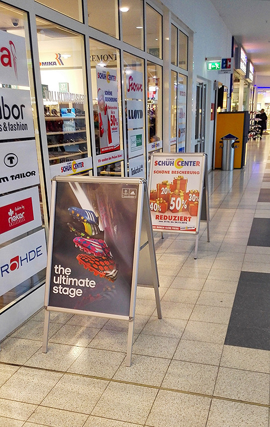 Kundenstopper mit 32 mm Alu Klapp-Rahmen, eloxierter Alu-profil, galvanisierte Stahlrückwand (unlackiert). Rostfrei. Mit entspiegelte APET Frontplatten. Gestell in 15 x 30 mm viereckigem Alu-Rohr.