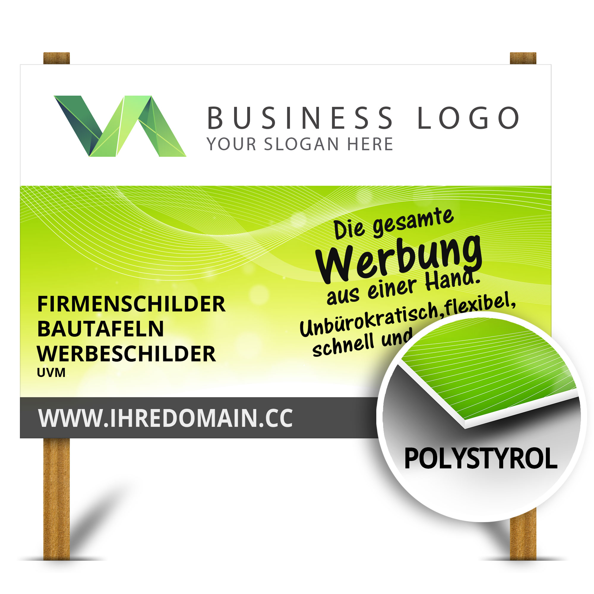 Direkt bedrucktes Polystyrol-Werbeschild, optional auch mit beidseitigen Druck.